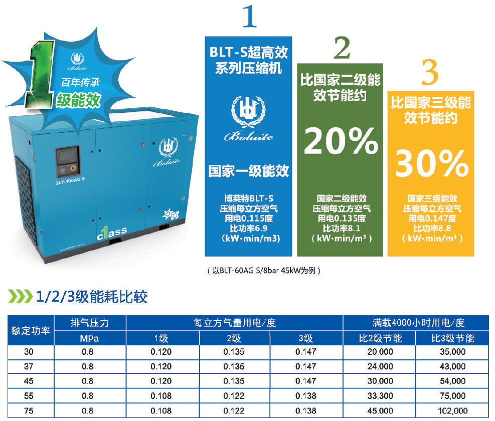 博萊特BLT S超高效系列壓縮機全部達到國家1級能效,比二級能效節(jié)能約20%,比三級能效節(jié)能約30%